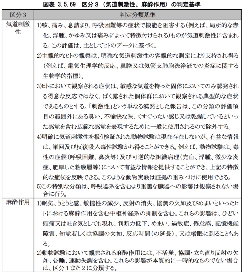 区分の分類基準および区分3(気道刺激性・麻酔作用)の判定基準は、以下のとおりです。