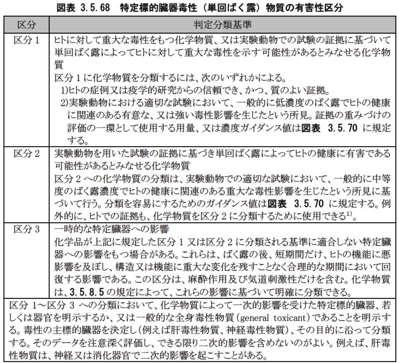 特定標的臓器毒性、単回ばく露(specific target organ toxicity, single exposure) 単回ばく露によって起こる特定臓器に対する特異的な非致死性の毒性。 なお、単回ばく露は、可逆的若しくは不可逆的、又は急性若しくは遅発性の機能を損な う可能性がある、全ての重大な健康への影響を含む。