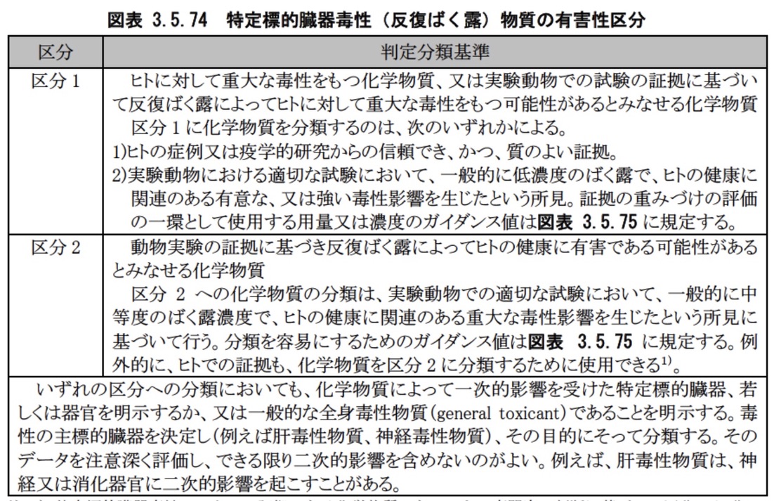 特定標的臓器毒性、反復ばく露(specific target organ toxicity, repeated exposure) 反復ばく露によって起こる特定臓器に対する特異的な非致死性の毒性。 なお、反復ばく露は、可逆的若しくは不可逆的、又は急性若しくは遅発性の機能を損な う可能性がある、全ての重大な健康への影響を含む。