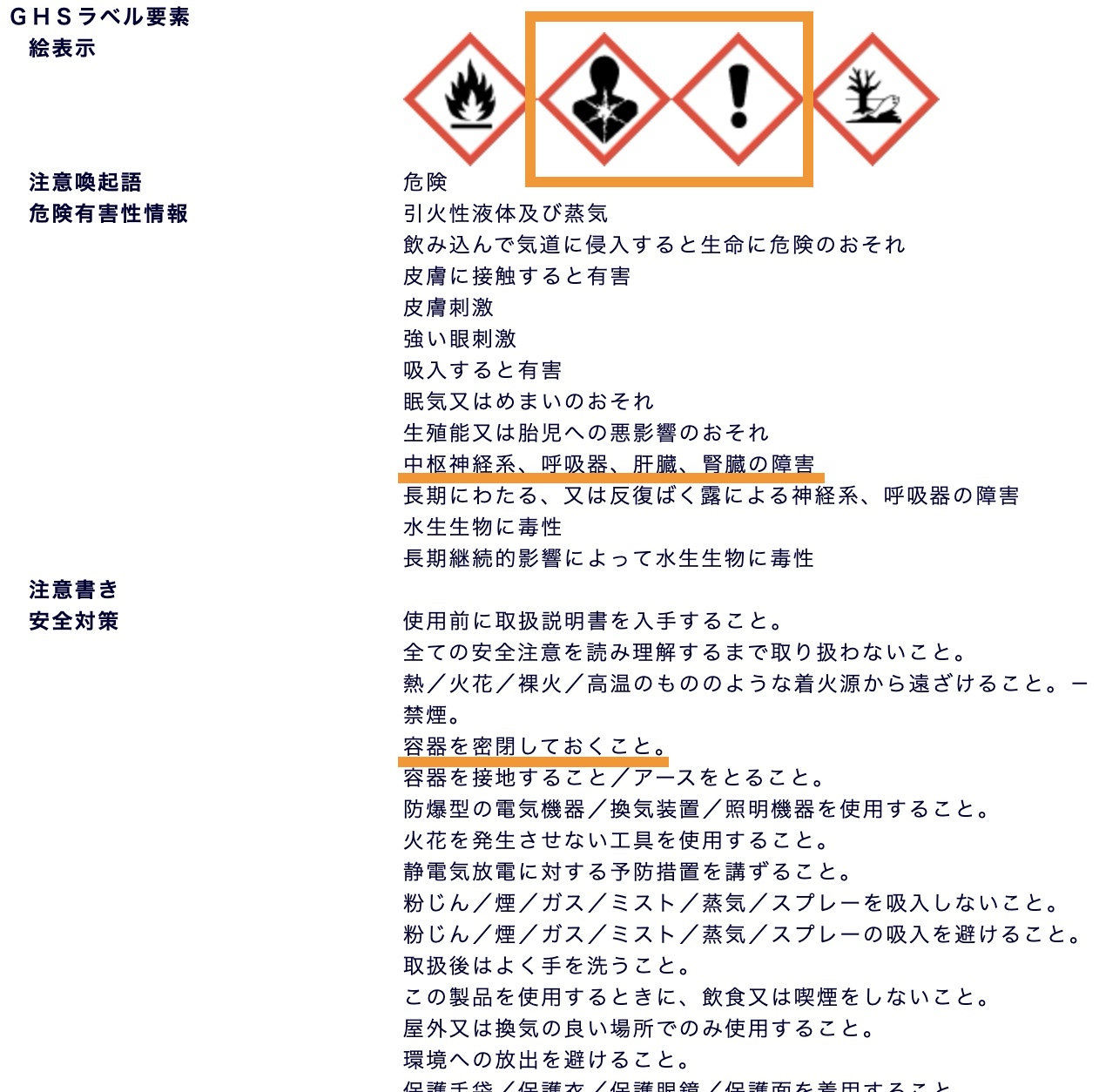 さらに、「H370:臓器の障害」といったHコードや、「P233:容器を密閉しておくこと」などのPコードから、具体的な危険性や取扱い上の注意点が確認できます。