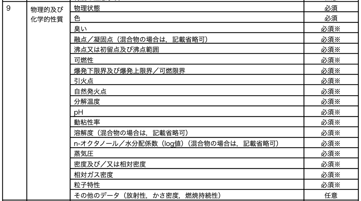 1項のパートでも記載しましたが、JISでは9項に(仮に具体 的なデータがない場合でも)記載が必須と定められている項目があります。以下、その項目を記載します。